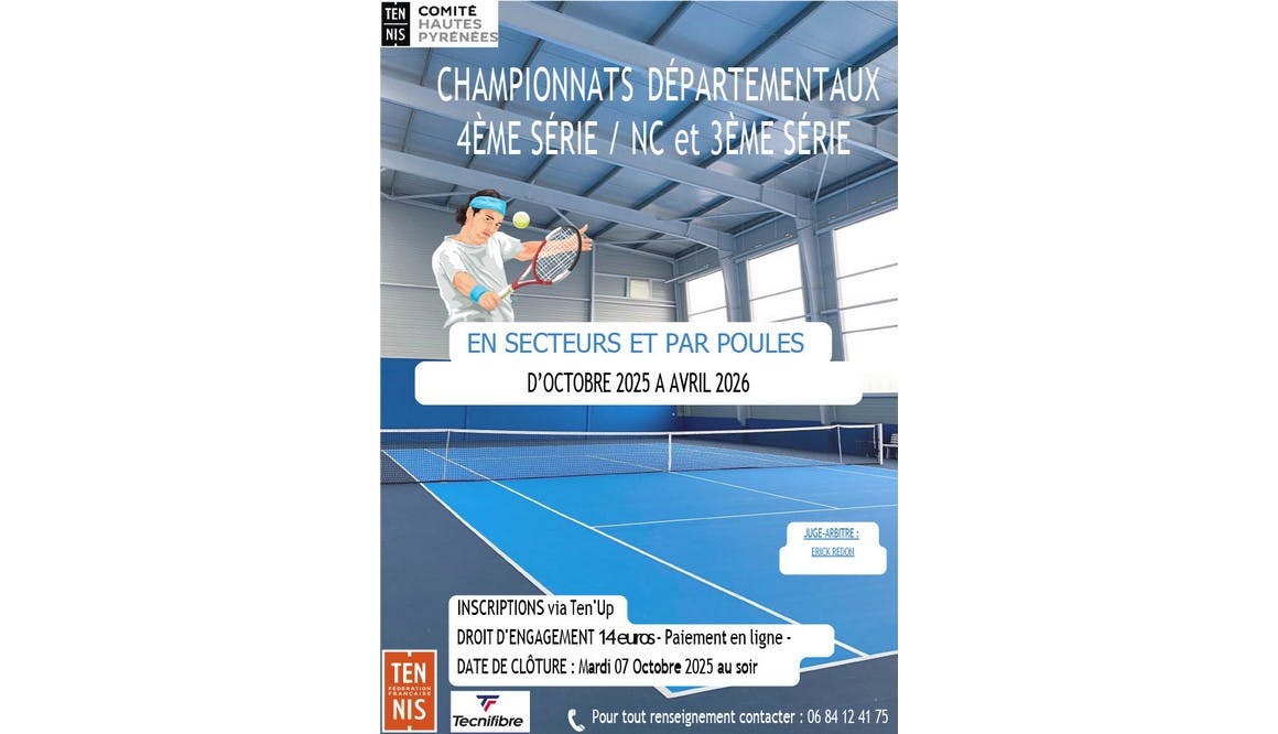 Les championnats départementaux individuels 4ème série-non classés et 3ème série sont organisés par le comité départemental de tennis sis 1 chemin de Bastillac – plaine des jeux René Valmy – à TARBES. Ils sont exclusivement ouverts aux joueurs de nationalité française, ainsi qu’aux ressortissants de l’Union européenne, licenciés dans les clubs affiliés du département des Hautes-Pyrénées.